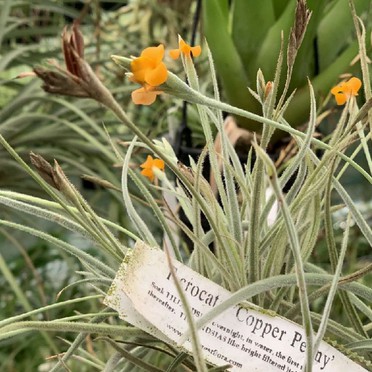 Tillandsia crocata 'copper penny' grows slightly larger than the standard form of tillandsia crocata. Crocata x rutchman's orange or mock orange, or buttercup, or another out of the group). That is if you are a tillandsia buff. This cultivar has larger thicker leaves than normal crocata and also has a orange colored flower that is fragrant. Calignosa features more rigid leaves than t.